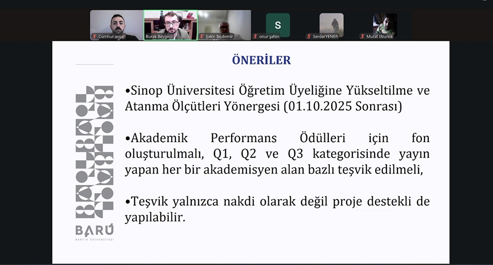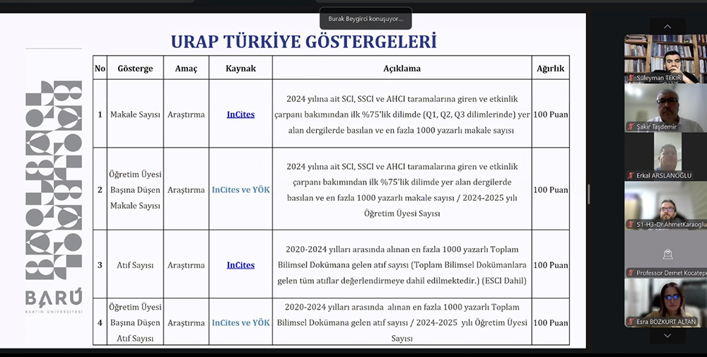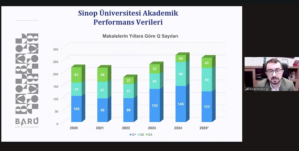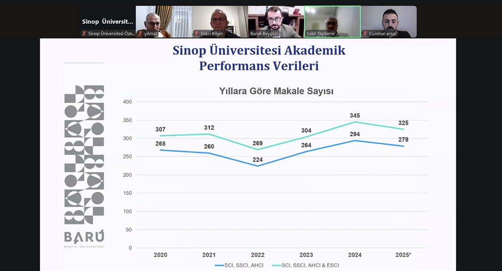 Toplantıda Bartın Üniversitesini temsilen Kütüphane ve Dokümantasyon Daire Başkanı ve Bilimsel Yayınlar Koordinatörü Burak Beygirci yer aldı. URAP değerlendirme kriterleri, sıralama göstergeleri ve üniversitelerin akademik performansını etkileyen temel bileşenler üzerine gerçekleştirilen programda Beygirci, Sinop Üniversitesi’nin yayın performansı, mevcut göstergeleri ve iyileştirme odaklı yürütülen çalışmalar hakkında kapsamlı bir sunum yaptı.
