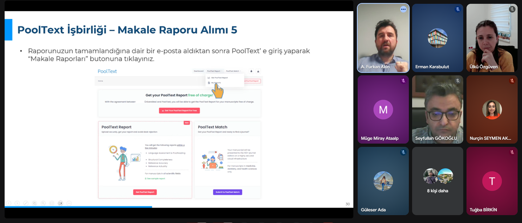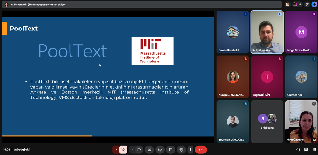 Eğitimde, MIT VMS destekli teknoloji altyapısına sahip olan PoolText platformunun, bilimsel makalelerin yapısal bütünlüğü ve akademik İngilizce kalitesi üzerindeki denetim mekanizmaları aktarılmıştır. Ayrıca, akademik çalışmaların hedef dergi standartlarına uygunluğunu ölçen objektif değerlendirme kriterleri uygulamalı örneklerle paylaşılmıştır.